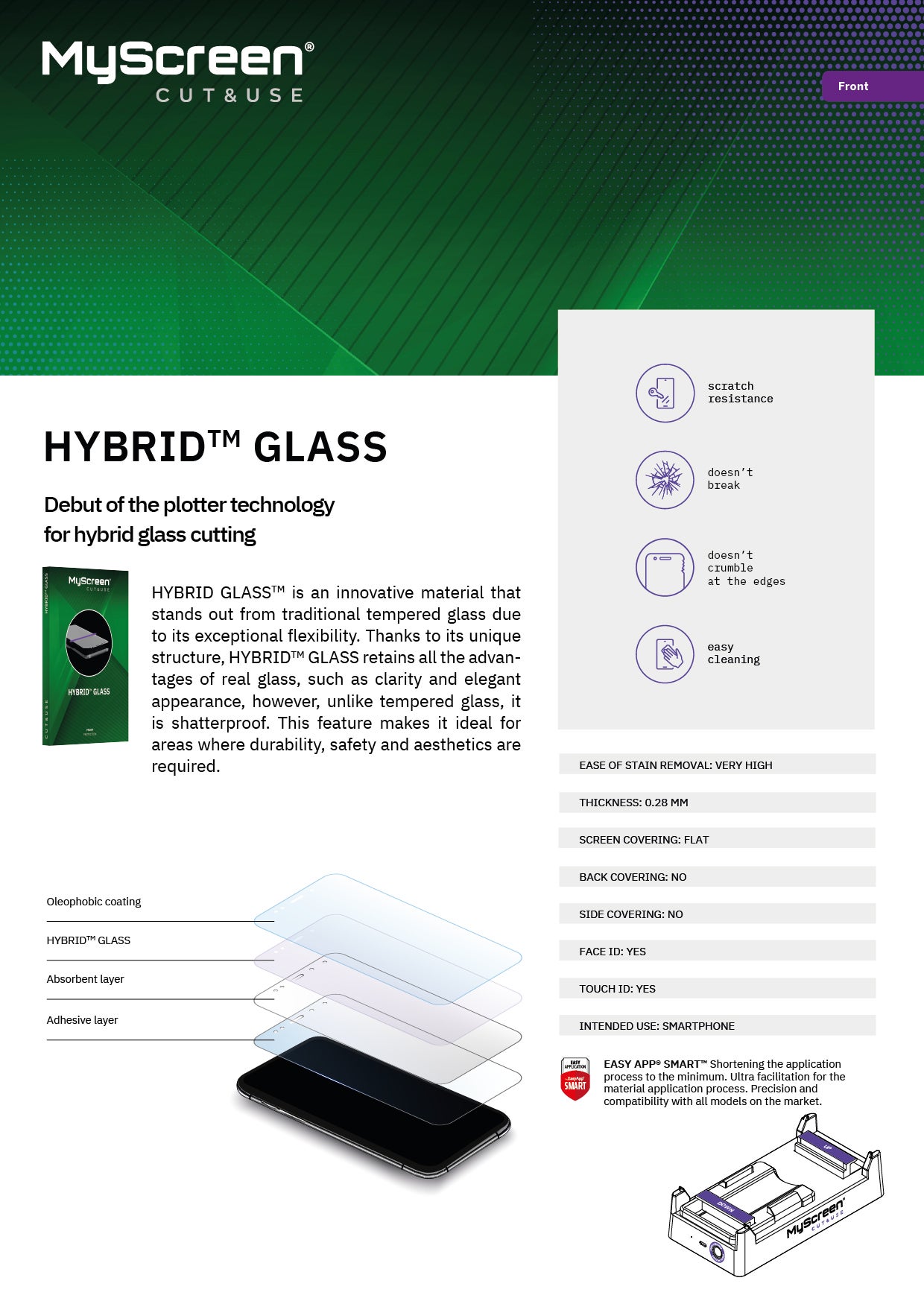 The hybrid glass is also easy to clean and retains its quality without crumbling at the edges. This combination of properties makes Myscreen Hybrid Glass an excellent choice for those seeking a reliable and aesthetically pleasing screen protector. With the debut of plotter technology for hybrid glass cutting, this material sets a new standard for screen protection.