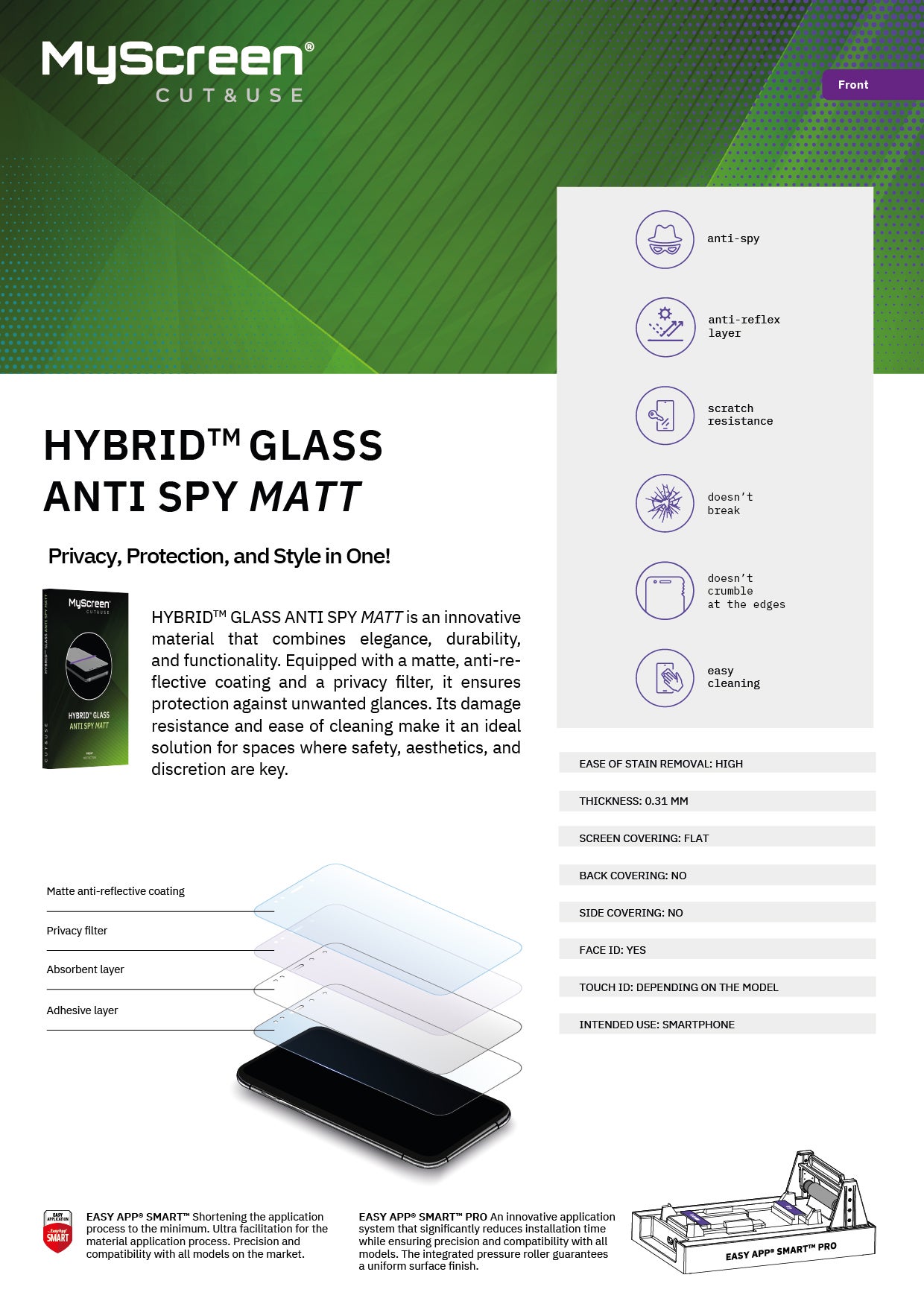 Detta antispionmatta hybridglas är ett innovativt material som kombinerar elegans, hållbarhet och funktionalitet. Det har en matt, antireflekterande beläggning och ett sekretessfilter som skyddar mot oönskade blickar. Glaset är reptåligt och utformat så att det inte går sönder eller smulas sönder i kanterna, vilket gör det till ett pålitligt val för att upprätthålla både säkerhet och estetik.